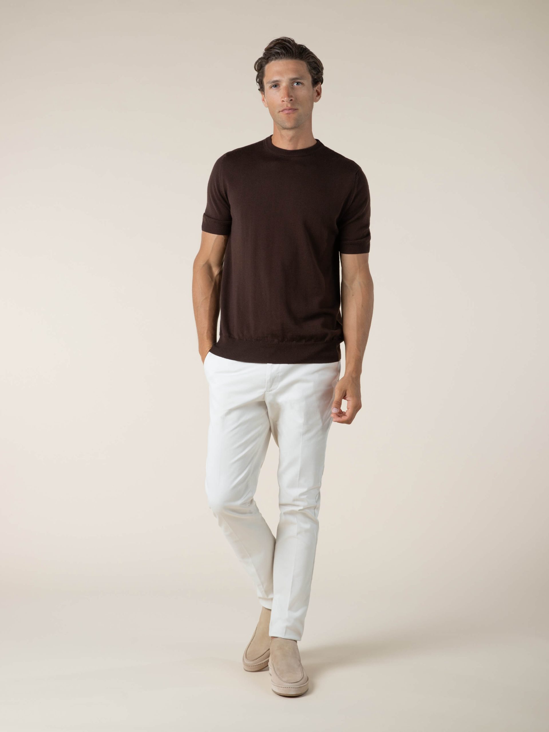 As shiny as silk, as soft as cashmere. This t-shirt is crafted in Italy from Cashwool®, an exceptionally fine fibre sourced from selected Merino sheep bred in Australia, only 19.5 microns in diameter. Ideal for refined leisure time looks.