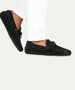 These shoes are unmistakably leisure oriented. They are the symbol of Mediterranean getaways and ultimate comfort. This style features luxurious Softey® suede with exposed hand stitching, hot-stamped emblem, front tie, iconic rubber pebble sole and combines diverse materials in a classically casual contrast. Combine it with a same colour belt to make your outfit complete.