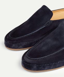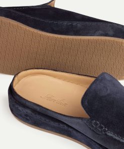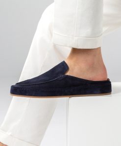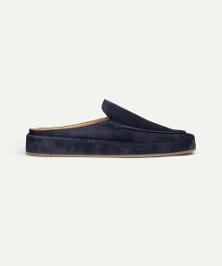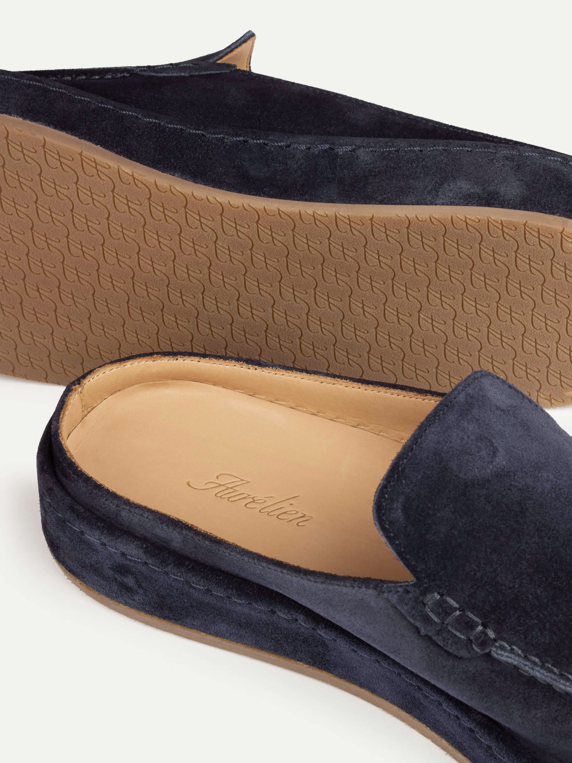 Our iconic Voyager Loafer is reimagined in a backless design, expertly crafted from supple suede and luxuriously lined with smooth leather. Its unique construction and stitching technique create a suede-trimmed sole that blends seamlessly with the silhouette. An ideal companion for seaside strolls or days spent at the beach.